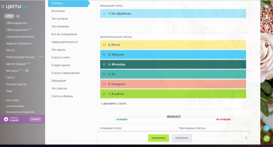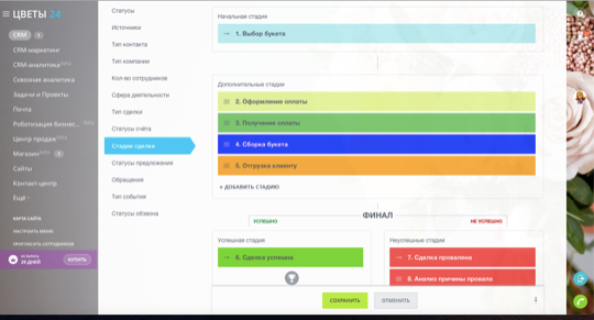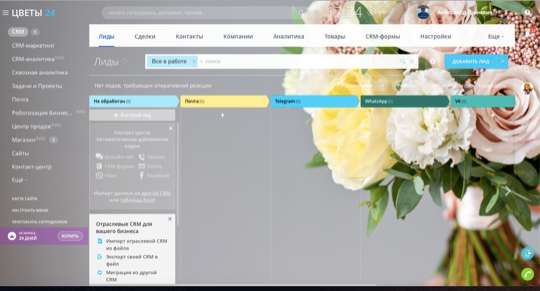 Настроенная CRM ЦВЕТЫ позволяет автоматизировать работу магазина доставки цветов.