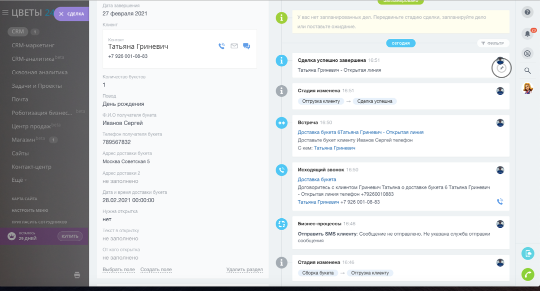 После доставки букета сделка закрывается и клиенту автоматически уходит сообщение в чат с благодарностью.